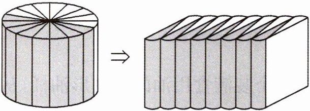 (1)如图所示,壮壮把一个圆柱转化成一个近似的长方体,形状变了,( )不变,近似长方体的底面积就是圆柱的( ),近似长方体的高就是圆柱的( ),所以圆柱的体积=( )。