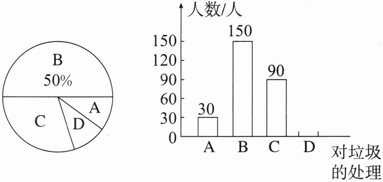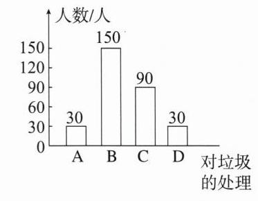5. 育才小学课外活动小组对全校师生开展了以“爱护环境,从我做起”为主题的问卷调查活动,下面的统计图是分析整理后的调查结果。其中,A表示能将垃圾分类并放到规定的地方;B表示能将垃圾放到规定的地方,但不分类;C表示偶尔会将垃圾放到规定的地方;D表示随手乱扔垃圾。根据以上信息回答问题。