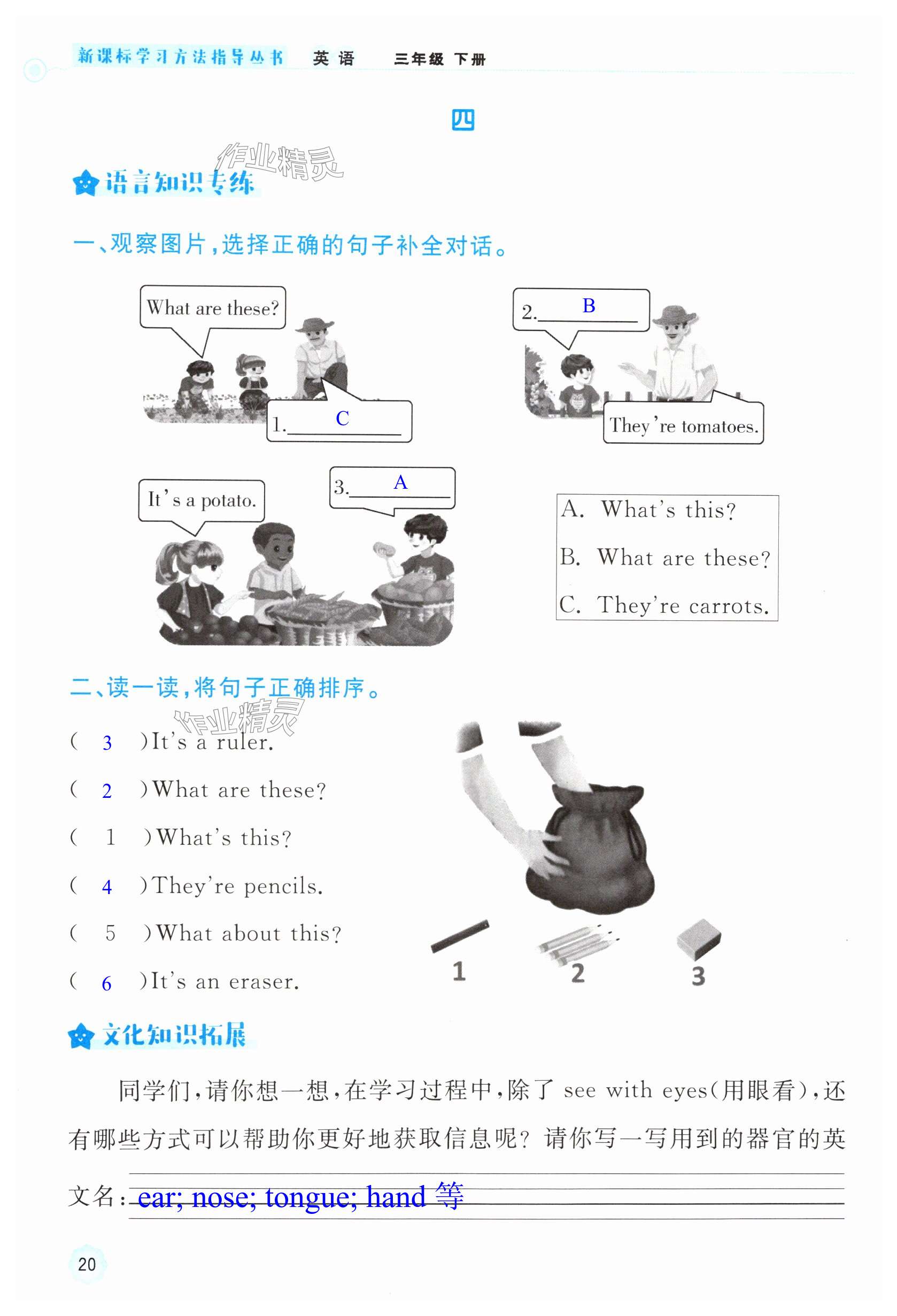 注:目前有些书本章节名称可能整理的还不是很完善,但都是按照顺序排列的,请同学们按照顺序仔细查找。练习册 2025年新课标学习方法指导丛书三年级英语下册人教版 答案主要是用来给同学们做完题方便对答案用的,请勿直接抄袭。