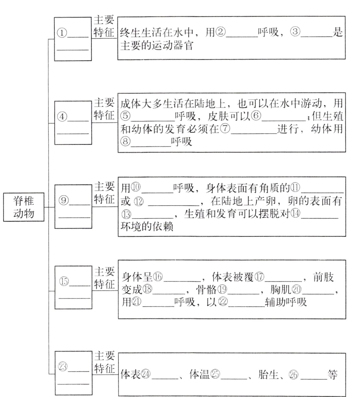 |①|鱼类|终生生活在水中,用②______呼吸,③______是主要的运动器官|