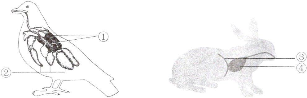 12. 下图是家鸽和家兔呼吸系统的结构示意图,请据图回答问题。(在方括号中填序号,在方括号后的横线上填相应的名称)