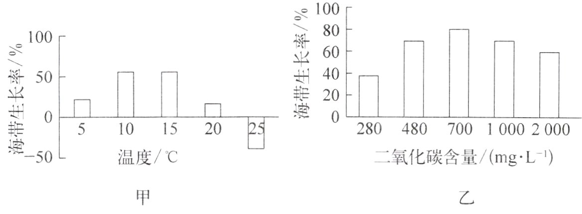 (2) 实验乙得出的数据表明:当环境中二氧化碳含量低于700mg/L时,海带的生长率会随二氧化碳含量的增加而______________;当环境中二氧化碳含量高于700mg/L时,海带的生长率会随二氧化碳含量的增加而______________。