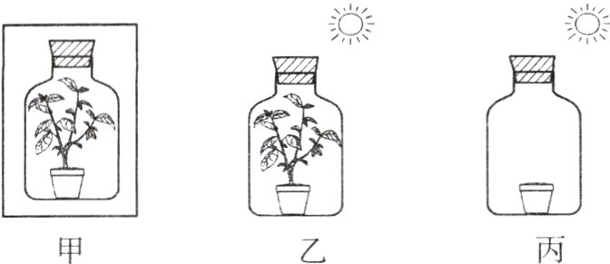 6. 取甲、乙、丙三只广口瓶,组装成如下图所示的实验装置,三只广口瓶内均含有大量的二氧化碳,瓶口密封。将甲瓶置于黑暗处,将乙、丙两瓶置于阳光下。2h后,在三只广口瓶内分别加入等量的质量分数为0.1%的溴麝香草酚蓝溶液。这个实验可以证明的结论是( )。