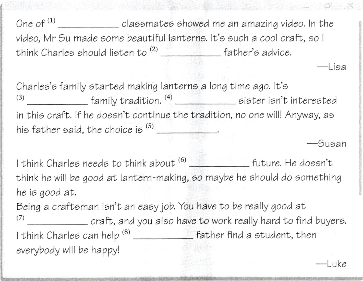 One of (1)____________ classmates showed me an amazing video. In the video, Mr Su made some beautiful lanterns. It's such a cool craft, so I think Charles should listen to (2)____________ father's advice.