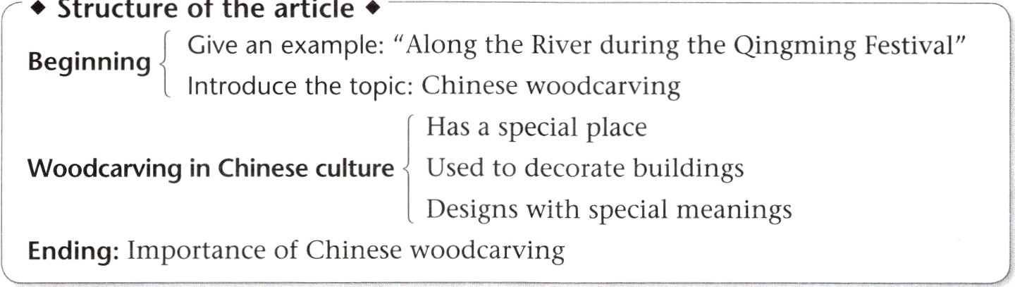 Use a sentence to connect the example to the topic of your introduction. This great work of art is a shining example of Chinese woodcarving. More than just an art form, woodcarving has a special place in Chinese culture. This craft is long used to decorate houses, towers and palaces with detailed scenes from ancient stories. Lots of Chinese woodcarvings have designs with special meanings, like the Chinese dragon, the fenghuang and bamboo. People believe that these symbols bring good luck and good energy.