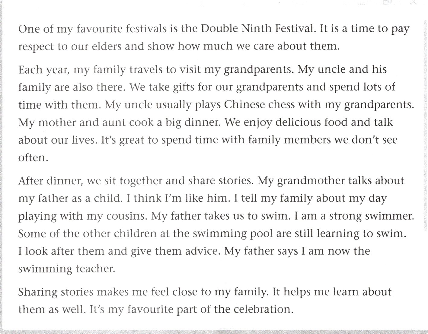 One of my favourite festivals is the Double Ninth Festival. It is a time to pay respect to our elders and show how much we care about them.