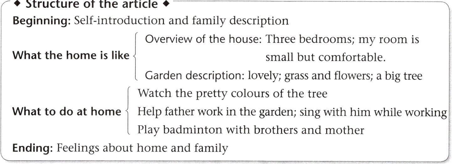 Use these expressions to introduce your home. There are three bedrooms in our house. I have my own room. It is small but very comfortable. We also have a lovely garden. It has a lot of grass and flowers. There is also a big tree at the end of the garden. I can see it from my bedroom window. I like to watch the pretty colours as the tree changes over the seasons.
