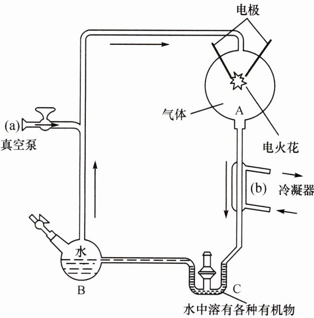 、水蒸气、氨、氢气等从(a)处泵入玻璃仪器内,再把B中的水煮沸,使水蒸气驱动混合气体在玻璃管内流动,然后在A内放电7天,经(b)冷却后,产物沉积在C中,产物含有包括氨基酸