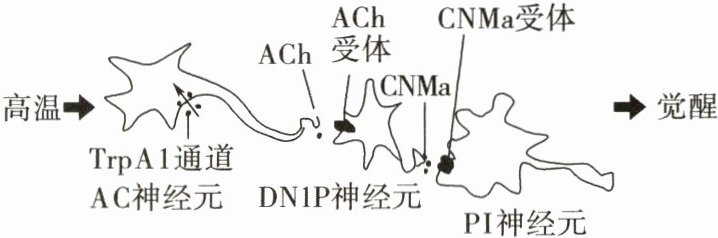 15.某研究发现,环境温度升高使AC神经元的阳离子通道(TrpA1)被激活,阳离子内流导致AC神经元兴奋。该信号通过神经传导,最终抑制PI神经元兴奋,从而促进夜晚觉醒,具体过程如图所示。下列相关分析错误的是 ( )