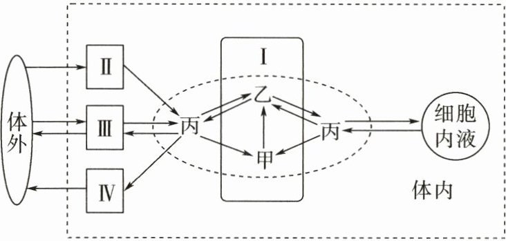 16. 内环境与外界环境的物质交换,需要体内各个器官、系统的参与。下图表示人体内的细胞与外界环境之间进行物质交换的过程。Ⅰ、Ⅱ、Ⅲ、Ⅳ表示不同的人体系统,甲、乙、丙表示三种体液。下列说法正确的是 ( )
