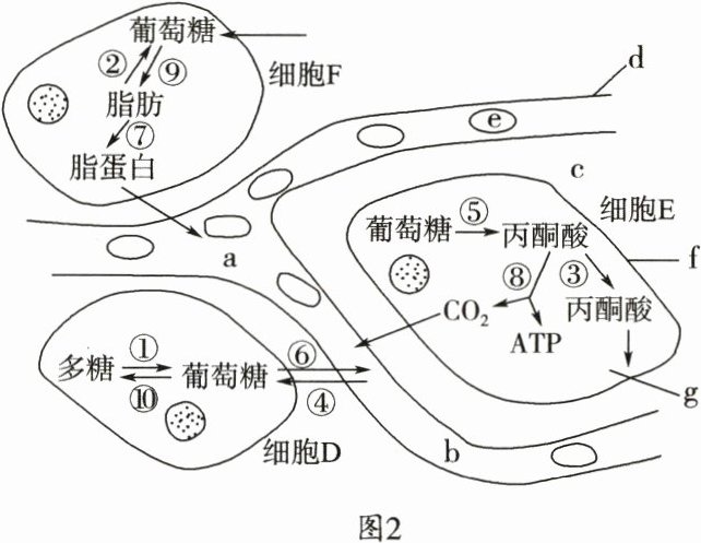 (4)图 2 中血细胞中的 O₂被组织细胞利用共穿过 层生物膜,图中 a、b、c、g 中 CO₂浓度最高的为标号[ ] (填名称)。