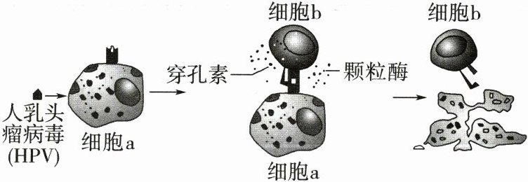 12.健康人的子宫感染人乳头瘤病毒(HPV)可能引发子宫颈癌。HPV 入侵机体感染细胞 a 后,机体作出免疫应答,细胞 b 与细胞 a 结合,细胞 b 释放穿孔素和颗粒酶,颗粒酶通过细胞膜上的孔道进入细胞,如图所示。下列叙述错误的是 ( )