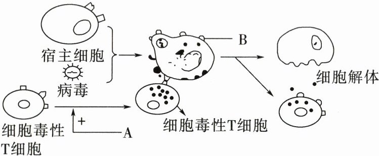 9.某种致病病毒侵入人体后发生的部分免疫反应如图所示,其中 A、B 为有关的物质。下列有关分析错误的是 ( )