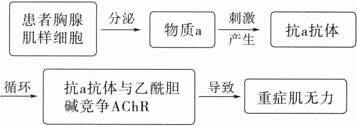 AC [物质a能刺激机体产生抗a抗体,只有体液免疫过程能产生抗体,说明物质a引发的免疫过程属于体液免疫,图中抗a抗体与乙酰胆碱受体结合,是由免疫功能过强引起的,A正确;物质a属于抗原,在此过程产生抗体的浆细胞可以来自B淋巴细胞或记忆B细胞,B错误;乙酰胆碱不能发挥作用,导致重症肌无力,说明乙酰胆碱是兴奋性神经递质,可以引起肌肉收缩,C正确;过敏反应和重症肌无力都是免疫功能过强引起的,前者是在机体二次接触抗原时才会有病症,后者不是,D错误。]