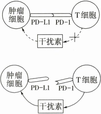 20.肿瘤细胞膜上的 PD-L1 能与 T 细胞的受体 PD-1(程序死亡蛋白-1)结合,抑制 T 细胞产生干扰素(一种细胞因子,能抑制肿瘤细胞的增殖),其作用过程如图所示。下列叙述错误的是( )