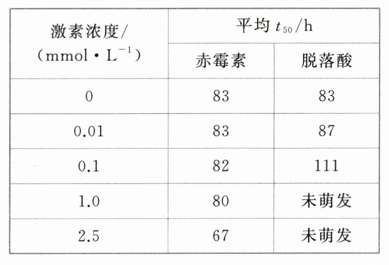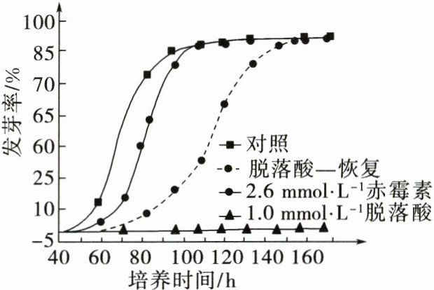 14.下表和图为外加激素处理对某种水稻萌发影响的结果。萌发速率(t₅₀)表示最终发芽率为 50%时所需的时间,发芽率为萌发种子在总数中的比例。“脱落酸—恢复”组为 1.0 mmol·L⁻¹脱落酸浸泡后,洗去脱落酸。下列相关叙述正确的是 ( )