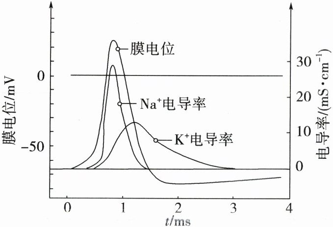 3.研究发现动作电位期间,细胞膜对 Na⁺和 K⁺的通透性均增大,但两者在增大程度和时间上是不一致的。据图分析,下列说法不合理的是 ( )