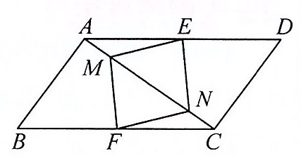 【分析】(1)证$\triangle AEM\cong\triangle CFN$($SAS$),得$EM = FN$,$\angle AME = \angle CNF$,则$\angle EMN = \angle FNM$,证出$EM// FN$,即可得出结论。