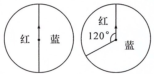 【例】 用图中两个可自由转动的转盘做“配紫色”游戏:分别转动两个转盘,若其中一个转出红色,另一个转出蓝色即可配成紫色,则可配成紫色的概率是