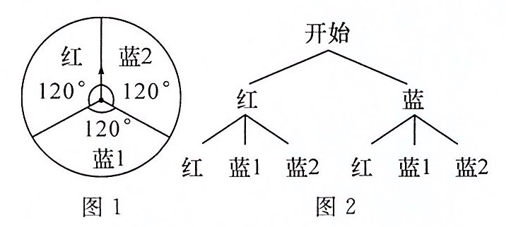 【分析】 如图 1,将第二个转盘中的蓝色部分等分成两部分,分别记为蓝 1、蓝 2. 画树状图如图 2: