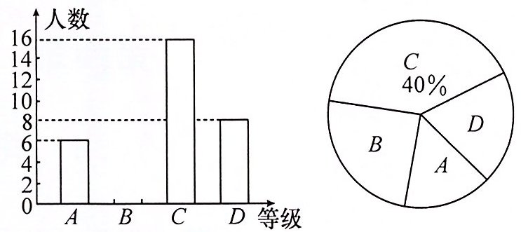 (2)扇形统计图中"D"等级的扇形的圆心角的度数为$360^{\circ}×\frac{8}{40}=72^{\circ}$,"B"等级的人数为$40-6-16-8=10$(人),补全条形统计图略.