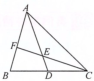 【变式 2】 如图,在 $ \triangle ABC $ 中,$ AD $ 为 $ BC $ 边上的中线,点 $ E $ 在 $ AD $ 上,射线 $ CE $ 交 $ AB $ 于点 $ F $。若 $\frac{DE}{AE} = \frac{1}{3}$,则 $\frac{AF}{FB} =$