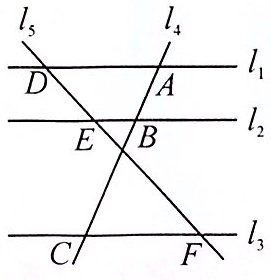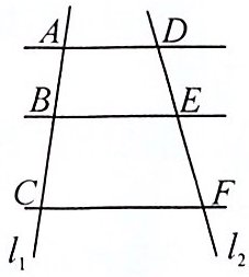 【例 1】 如图,已知直线 $ l_1 $,$ l_2 $,$ l_3 $ 分别截直线 $ l_4 $ 于点 $ A $,$ B $,$ C $,截直线 $ l_5 $ 于点 $ D $,$ E $,$ F $,且 $ l_1 // l_2 // l_3 $。