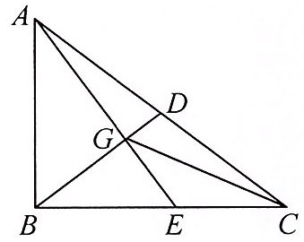 【例】 如图,在 $Rt\triangle ABC$ 中,$\angle ABC = 90^{\circ}$,$D$ 是斜边 $AC$ 的中点,连接 $DB$,线段 $AE\perp BD$ 于点 $G$,交 $BC$ 于点 $E$.