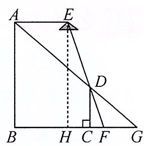 【变式】如图,$ AB $ 为路灯主杆,$ AE $ 为路灯的悬臂,$ AE $ 长 $ 3 $ 米,$ CD $ 是长为 $ 1.8 $ 米的标杆。已知路灯悬臂 $ AE $ 与地面 $ BG $ 平行,当标杆竖立子地面时,主杆顶端 $ A $、标杆顶端 $ D $ 和地面上一点 $ G $ 在同一直线上,此时路灯 $ E $、标杆顶端 $ D $ 和地面上另一点 $ F $ 也在同一条直线上(路灯主杆底端 $ B $、标杆底端 $ C $ 和地面上点 $ F $、点 $ G $ 在同一水平线上)。这时测得 $ FG $ 长 $ 1.5 $ 米,则路灯主杆 $ AB $ 的高度为