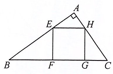 $【$例$】$如图,在$Rt\triangle ABC$中,$\angle BAC = 90°,$$AB = 20\ cm,$$AC = 15\ cm,$在这个直角三角形内有一个内接正方形$EFGH,$正方形的一边$FG$在$BC$上,另两个顶点$E,$$H$分别在边$AB,$$AC$上$.$