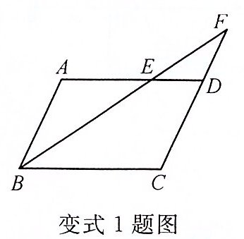 【变式 1】如图,$E$是$□ ABCD$的边$AD$上的一点,且$\frac{DE}{AE} = \frac{1}{2}$,连接$BE$并延长交$CD$的延长线于点$F$。若$DE = 3$,$DF = 4$,则$□ ABCD$的周长为