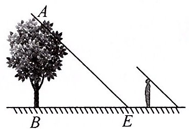【例 1】如图,一棵树(AB)的高为 7.5 米,下午某一个时刻它在水平地面上形成的树影长(BE)为 10 米,现在小明想要站这棵树下乘凉,他的身高为 1.5 米,那么他最多离开树干多少米才可以不被阳光晒到?