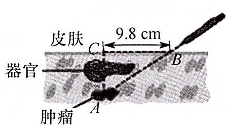 【变式】如图,一名患者体内某重要器官后面有一肿瘤。在接受放射性治疗时,为了最大限度地保证疗效,并且防止伤害器官,射线必须从侧面照射肿瘤。若肿瘤在皮下 $6.3\ cm$ 的 $A$ 处,射线从肿瘤右侧 $9.8\ cm$ 的 $B$ 处进入身体,则射线与皮肤所成的锐角约为