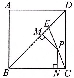 【分析】 连接 $BP$,作 $EF \perp BC$ 于点 $F$,由正方形的性质可知 $\triangle BEF$ 为等腰直角三角形,$BE = 1$,可求 $EF$,利用面积法得 $S_{\triangle BPE} + S_{\triangle BPC} = S_{\triangle BEC}$,再利用整体思想即可求得 $PM + PN$ 的值.