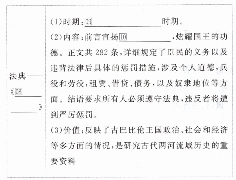 ①两河流域 ②苏美尔人 ③楔形文字 ④吉尔伽美什 ⑤亚述 ⑥人首飞牛 ⑦波斯 ⑧汉谟拉比法典 ⑨古巴比伦王国 ⑩君权神授