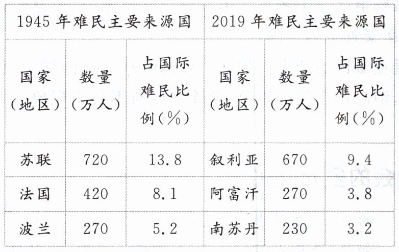 [材料解读] 材料一对比了1945年和2019年的难民情况,从来源国看,1945年的三个国家都来自欧洲,这主要与二战有关,20119年的来自亚洲和非洲,这主要与动荡的国际局势有关;从数量和占国际难民比例看,1945年1410万难民占比27.1%,2019年1170万难民占比16.4%,1945年三个主要来源国占国际难民比例更高,更加集中。材料二中,①表明难民问题产生的根源;②③表明中国的一贯态度以及为解决难民问题作出的承诺,体现了中国的责任感。