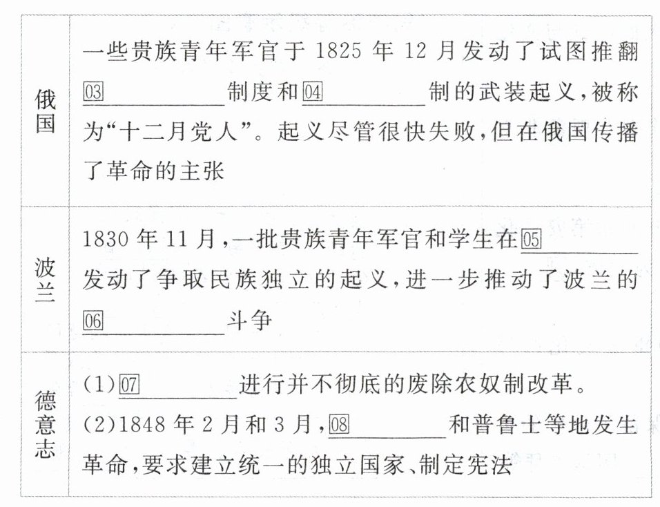 ①拿破仑法典 ②启蒙 ③沙皇专制 ④农奴 ⑤华沙 ⑥民族解放 ⑦普鲁士 ⑧奥地利