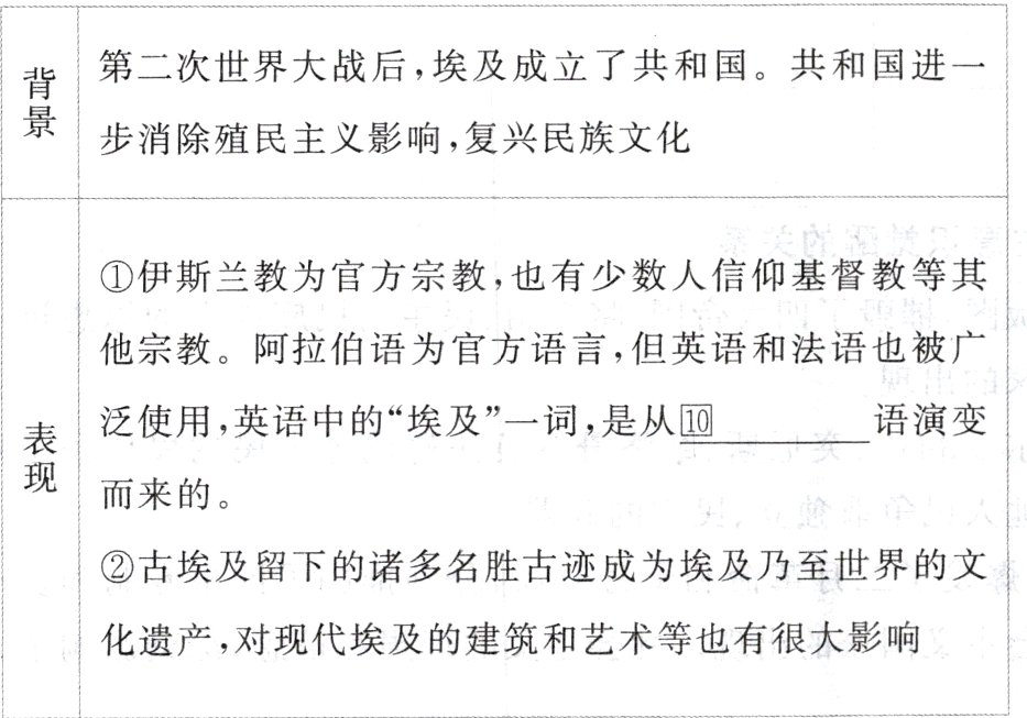 ①西方文化 ②自由主义 ③政治体制 ④甘地思想 ⑤种姓 ⑥新兴工业 ⑦儒家文化 ⑧东方文化 ⑨阿拉伯 ⑩古希腊