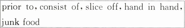 1. prior to 2. sliced off 3. consists of 4. junk food 5. hand in hand