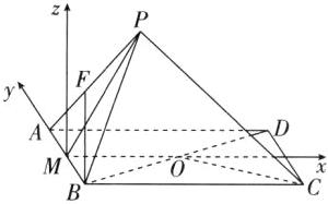 对于C,建立如图所示的空间直角坐标系,则$P(1,0,\sqrt{3})$,$C(3,-1,0)$,$O(\frac{3}{2},0,0)$,$B(0,-1,0)$,$D(3,1,0)$,则$\overrightarrow{CP}=(-2,1,\sqrt{3})$,$\overrightarrow{CO}=(-\frac{3}{2},1,0)$,$\therefore\cos\angle PCO=\frac{\overrightarrow{CP}\cdot\overrightarrow{CO}}{\vert\overrightarrow{CP}\vert\vert\overrightarrow{CO}\vert}=\frac{4}{2\sqrt{2}\times\frac{\sqrt{13}}{2}}=\frac{2\sqrt{2}}{\sqrt{13}}$,$\tan\angle PCO=\frac{\sqrt{5}}{2\sqrt{2}}=\frac{\sqrt{10}}{4}$,C错误。