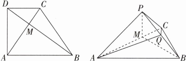 5.(2024 山东淄博二模,17)已知直角梯形 ABCD,∠ADC = 90°,AB//CD,AB = 2CD = $\sqrt{6}$,AD = $\sqrt{3}$,M 为对角线 AC 与 BD 的交点.现以 AC 为折痕把△ADC 折起,使点 D 到达点 P 的位置,点 Q 为 PB 的中点,如图所示.