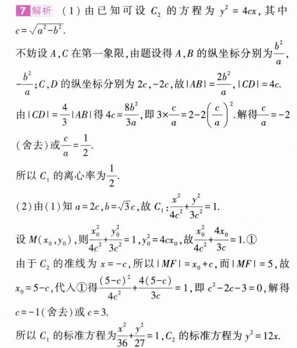 7.(2020课标II理,19,12分,中)已知椭圆$C_1:\frac{x^{2}}{a^{2}}+\frac{y^{2}}{b^{2}}=1(a>b>0)$的右焦点$F$与抛物线$C_2$的焦点重合,$C_1$的中心与$C_2$的顶点重合.过$F$且与$x$轴垂直的直线交$C_1$于$A,B$两点,交$C_2$于$C,D$两点,且$|CD|=\frac{4}{3}|AB|$.