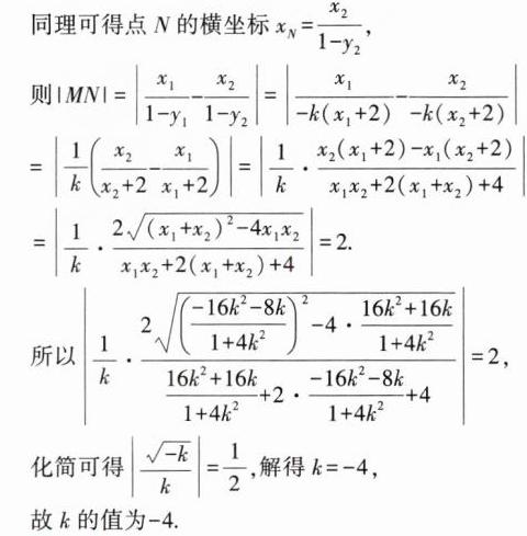 (2)过点$P(-2,1)$作斜率为$k$的直线与椭圆$E$交于不同的两点$B,C$,直线$AB,AC$分别与$x$轴交于点$M,N$.当$|MN|=2$时,求$k$的值.