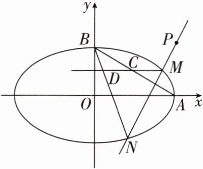 1. (2024湖南长沙市四县区3月调研,18)如图,已知A,B分别是椭圆E:$\frac{x^{2}}{a^{2}}+\frac{y^{2}}{b^{2}} = 1$的右顶点和上顶点,椭圆E的离心率为$\frac{\sqrt{3}}{2}$,△ABO的面积为1.若过点P(a,b)的直线与椭圆E相交于M,N两点,过点M作x轴的平行线,分别与直线AB,NB交于点C,D.