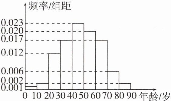 (1)平均年龄为$(5\times0.001 + 15\times0.002+25\times0.012 + 35\times0.017+45\times0.023+55\times0.020+65\times0.017+75\times0.006+85\times0.002)\times10 = 47.9$(岁)。