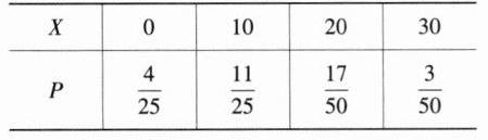 $\therefore E(X)=0\times\frac{4}{25}+10\times\frac{11}{25}+20\times\frac{17}{50}+30\times\frac{3}{50}=13$。