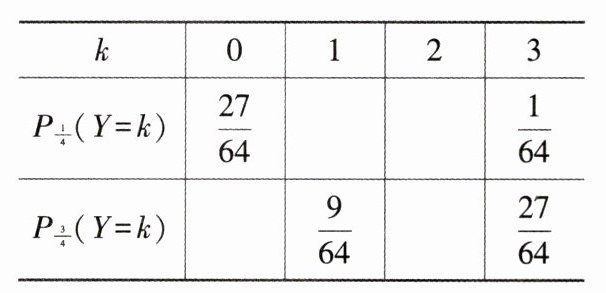 当 $p=\frac{3}{4}$ 时,$P(Y = 0)=C_{3}^{0}p^{0}(1 - p)^{3}=\frac{1}{64}$,$P(Y = 2)=C_{3}^{2}p^{2}(1 - p)=\frac{27}{64}$。