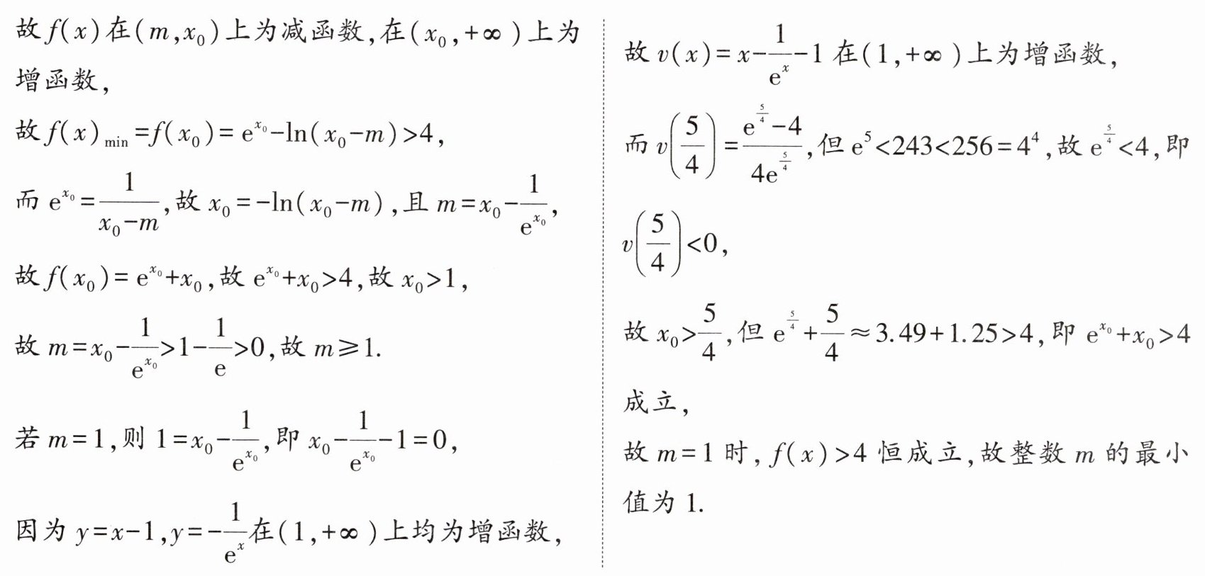 (2)若对定义域内的一切实数$x$,都有$f(x)>4$,求整数$m$的最小值。(参考数据:$e^{\frac{5}{4}}\approx3.49$)