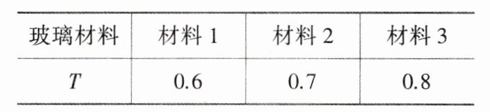12.(多选)(2024重庆八中等多校适应性考试,10)吸光度是指物体在一定波长范围内透过光子的能量占收到光能量的比例.透光率是指光子通过物体的能量占发出光能量的比例.在实际应用中,通常用吸光度$A$和透光率$T$来衡量物体的透光性能,它们之间的换算公式为$T = \frac{1}{10^A}$,下表为不同玻璃材料的透光率: