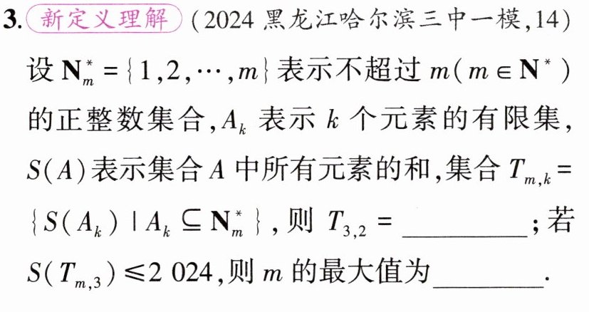 解析 当$m = 3$,$k = 2$时,$A_{2}$表示有2个元素的集合,$\mathbf{N}_{3}^{*}=\{1,2,3\}$,因为$A_{2}\subseteq\mathbf{N}_{3}^{*}$,且$A_{2}$有2个元素,所以$A_{2}=\{1,2\}$或$\{1,3\}$或$\{2,3\}$,所以$T_{3,2}=\{3,4,5\}$。